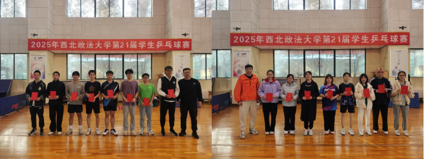 2025年11月8日,西北政法大学第二十一届学生乒乓球赛在长安校区体育馆顺利进行。本次比赛由西北政法大学体育部主办、西北政法大学乒乓球俱乐部承办,体育部副主任陶宝峰老师、群体管理中心主任张翔老师,裁判长邓力元老师出席颁奖仪式,最终取得了圆满成功。